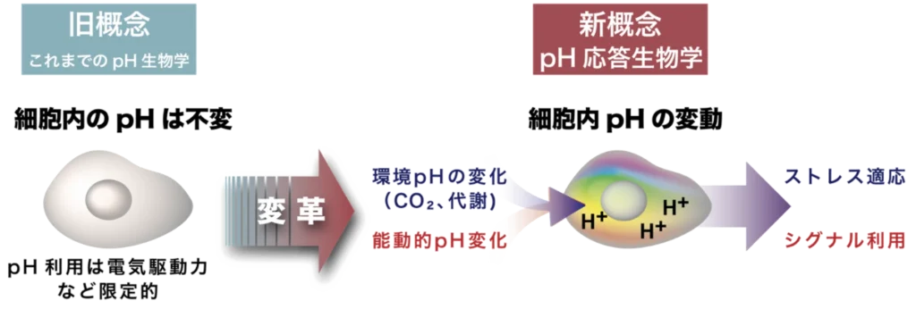 これまでの生命科学では、「細胞質内のpHは不変で安定している」という前提のもと研究が進められてきました。 しかし近年、技術の進展や新たな知見により、細胞質pHは環境変化によって常に変動のリスクにさらされており、生物がそれに応答・適応していること、さらには細胞自身が能動的にpHを変化させて生命活動の制御に利用していることが明らかになりつつあります。たとえば、大気中のCO2濃度が変化すると、水に溶けて生じる酸の量が変化し、環境のpHも大きく変動します。この変動は細胞内のpHにも波及します。加えて、細胞自身の代謝によっても酸が産生されるため、細胞内pHはつねに変動しやすいです。実際、代謝異常を呈するがん細胞や、恒常性が低下した老化細胞では、pHの異常がしばしば観察されます。このように、pHの変化は生物にとって不可避の課題であり、生物はその変化に応答・適応する仕組みを進化の過程で獲得してきたと考えられます。近年では、pHの変化を単なるストレスではなく、生命活動を調整するシグナルとして積極的に活用している可能性にも注目が集まっています。ただし、「細胞内pHは一定である」という従来の常識が根強かったこともあり、この分野の研究はいまだ発展途上にあります。