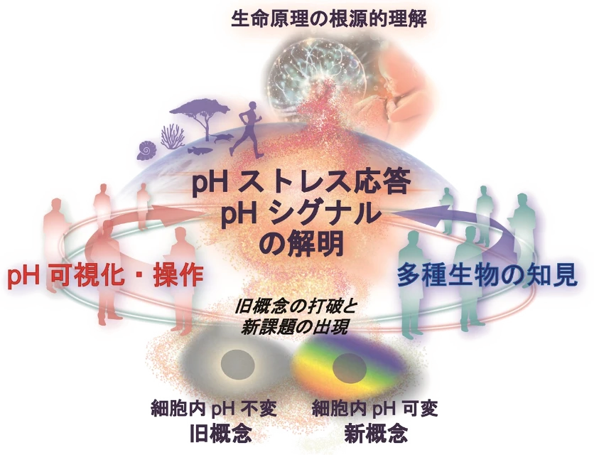 本領域は、生命はpH変動に応答し適応するための根本的な仕組み「pHストレス応答機構」、さらにそれを「pHシグナル」として巧みに利用する仕組みを、進化の過程で獲得してきたというという新たな視点に立ちます。そして、これまで類を見ない多様な生物種・生命現象を対象にし、最先端のpH可視化・操作技術を駆使した学際的・統合的なアプローチを展開します。これにより、従来のpHに関する概念を根底から覆し、「pH応答生物学」という新たな学術領域の創出を目指します(図1)。